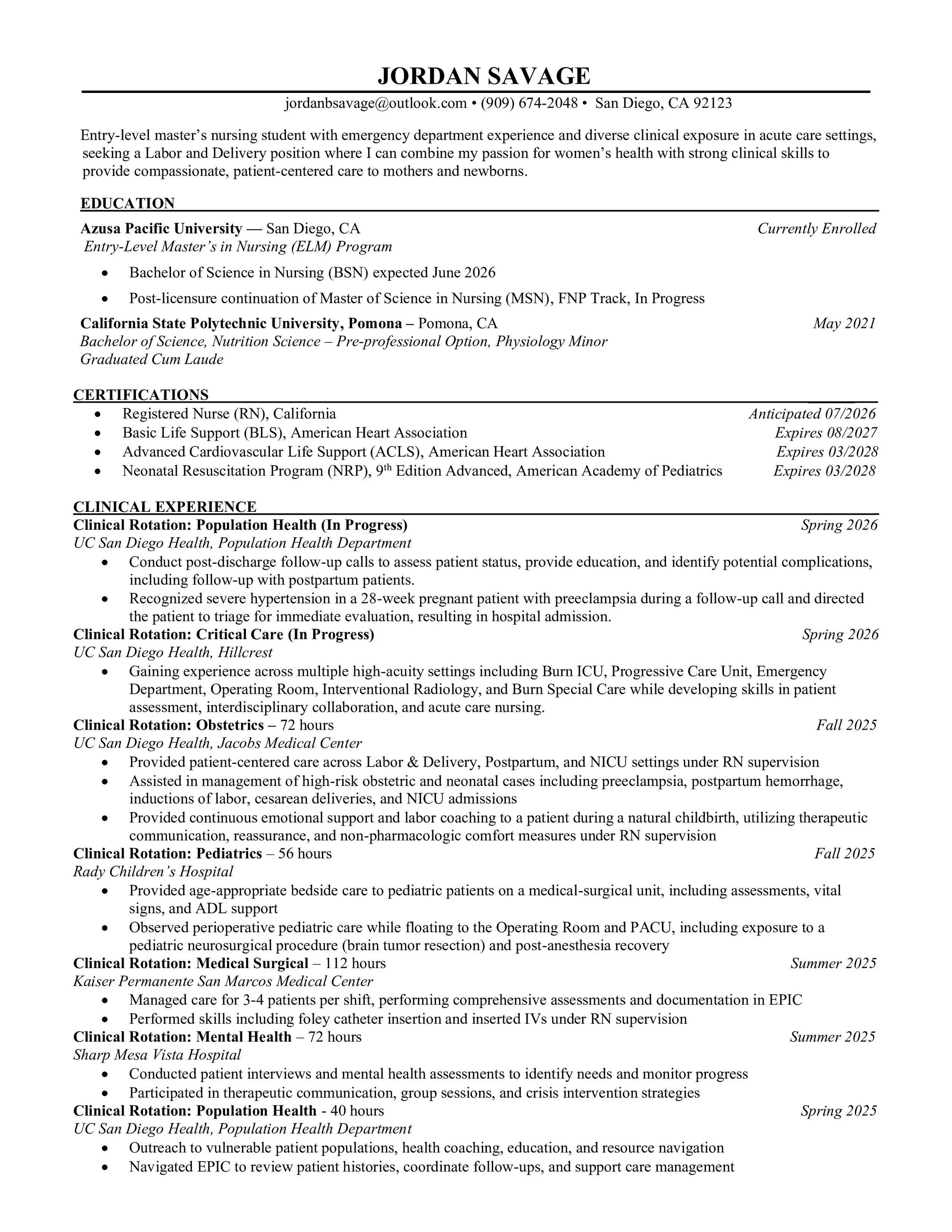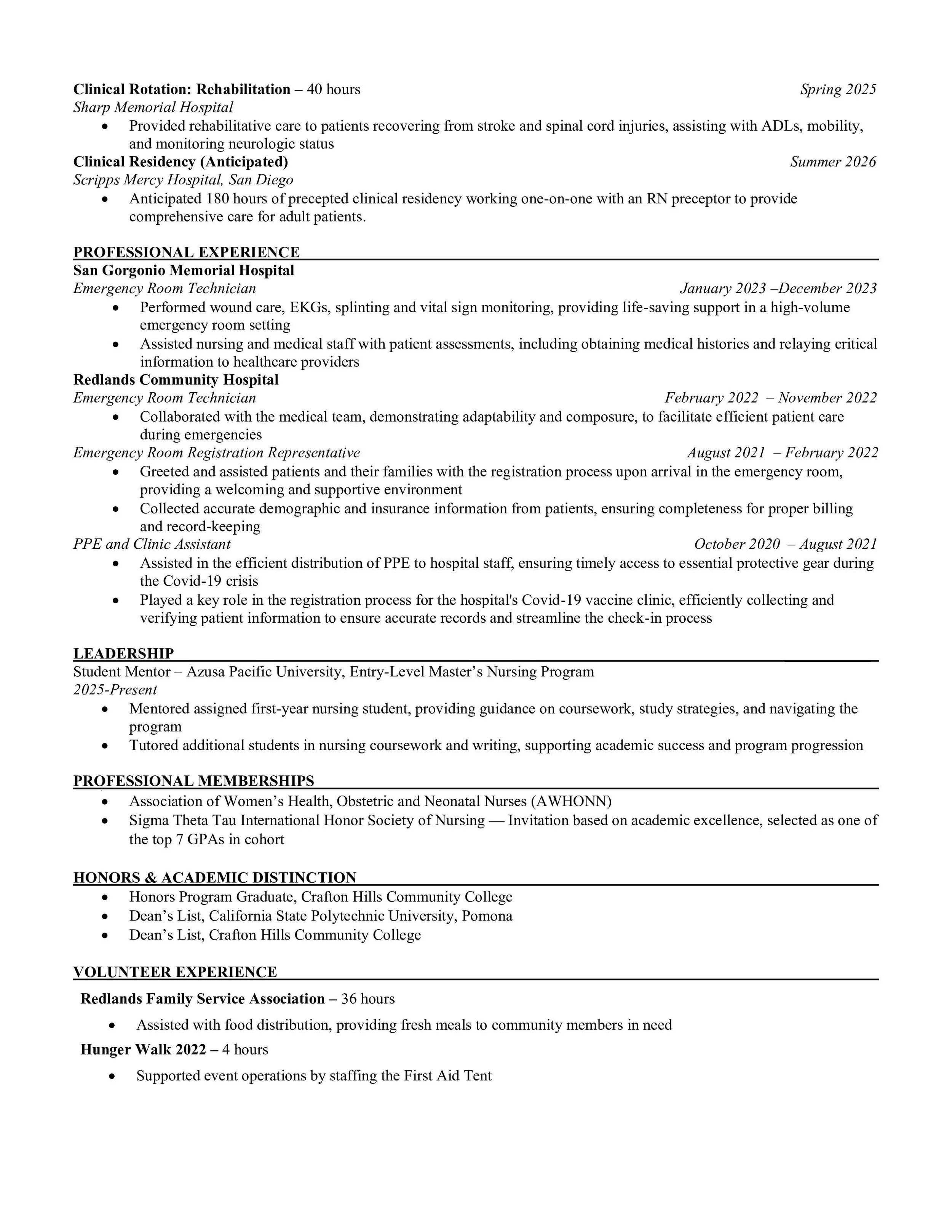 I bring a strong foundation in patient-centered care, clinical assessment, and interdisciplinary collaboration through both my nursing education and previous healthcare experience. My background as an Emergency Department Technician strengthened my ability to prioritize care, respond quickly in high-acuity situations, and communicate effectively with patients and healthcare teams. Through my clinical training, I have continued to develop skills in patient assessment, critical thinking, and evidence-based practice while providing compassionate care to diverse patient populations.